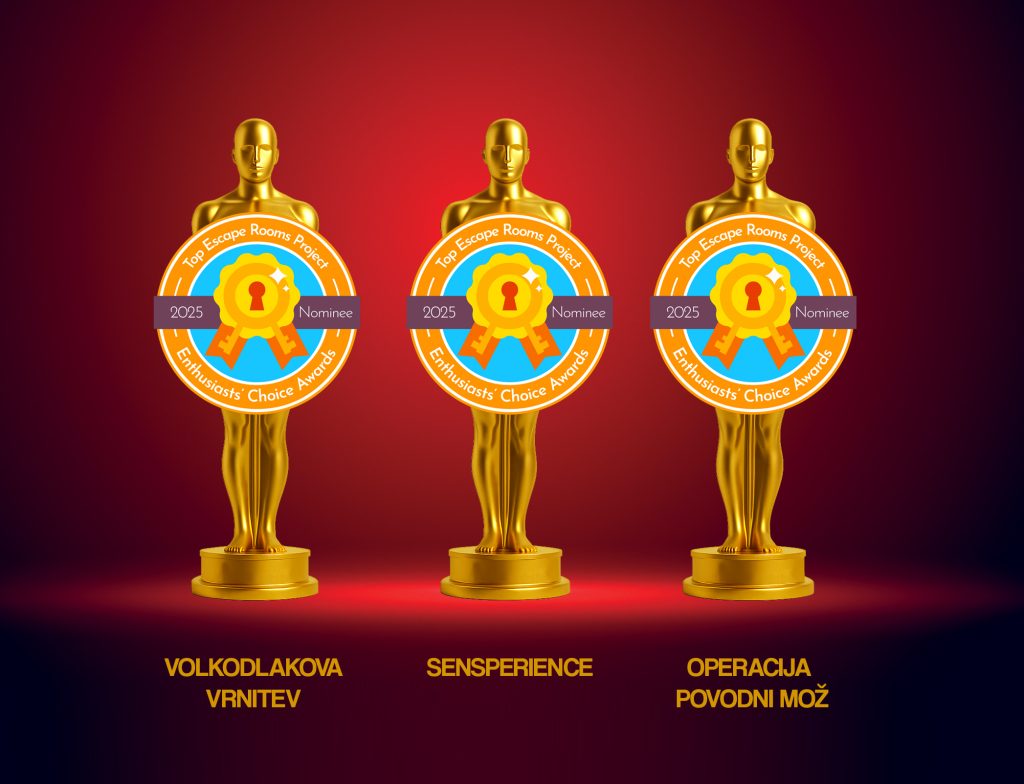 Kar tri naše igre so bile nominirane med najboljše sobe pobega na svetu. Ponosni. Hvaležni. In še bolj motivirani – da se naša naslednja soba uvrsti med finaliste.